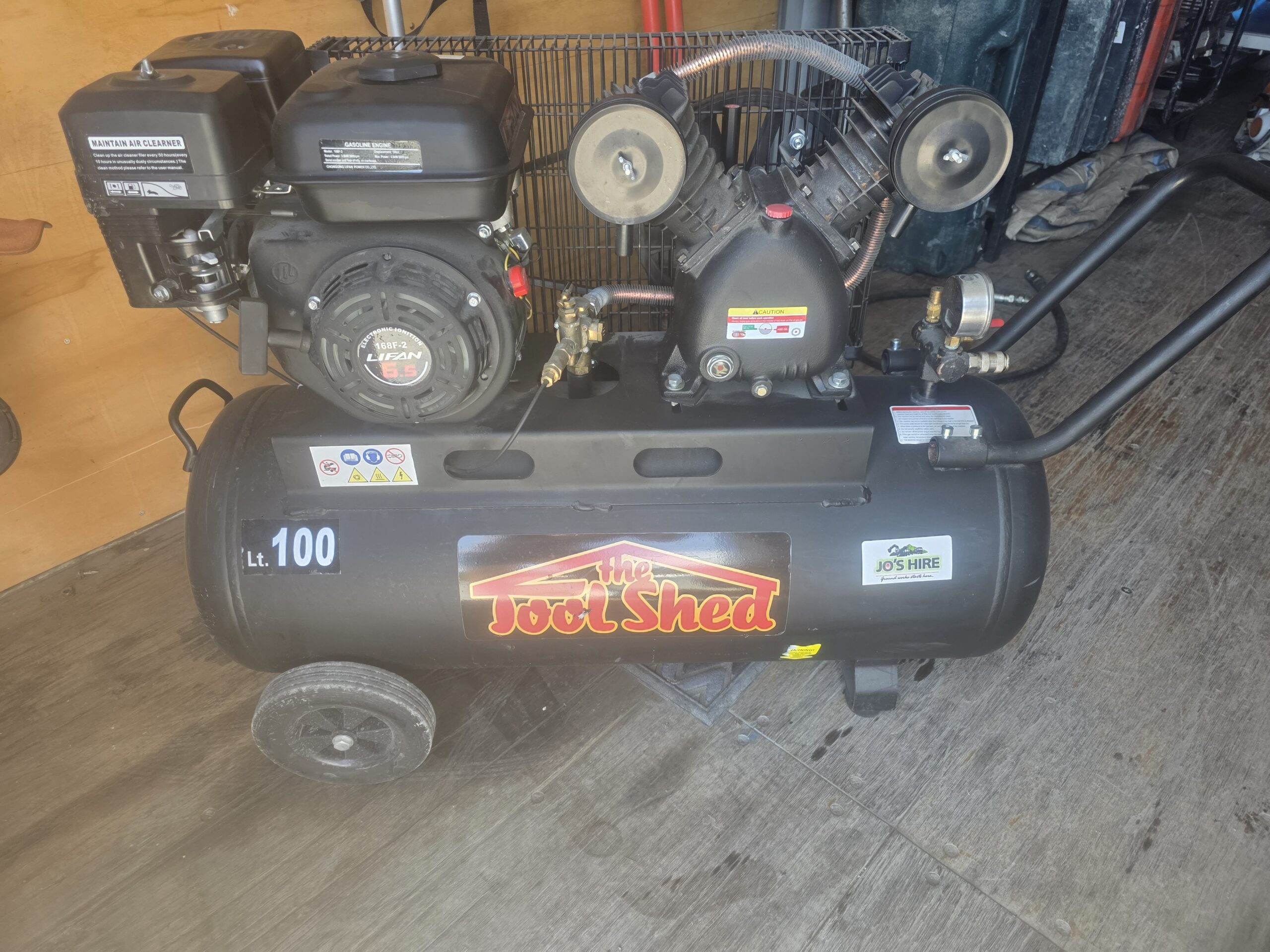 Full day: $120.00 incl GST Hire by PhoneHire by EmailSpecifications Power: Petrol Capacity: 100 Litre Description Air petrol compressor with a 6.5hp Lifan engine, 100-liter tank and 12.5CFM rating is a great portable option for tasks like operating air tools and inflating tyres.